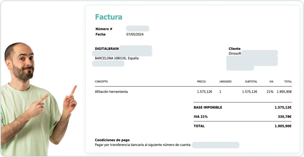 Cuando tengas comisiones pendientes, podrás generar la factura correspondiente y subirla a tu área de afiliados. Una vez que la factura ha sido cargada en DinoRANK, la revisaremos y la pagaremos.