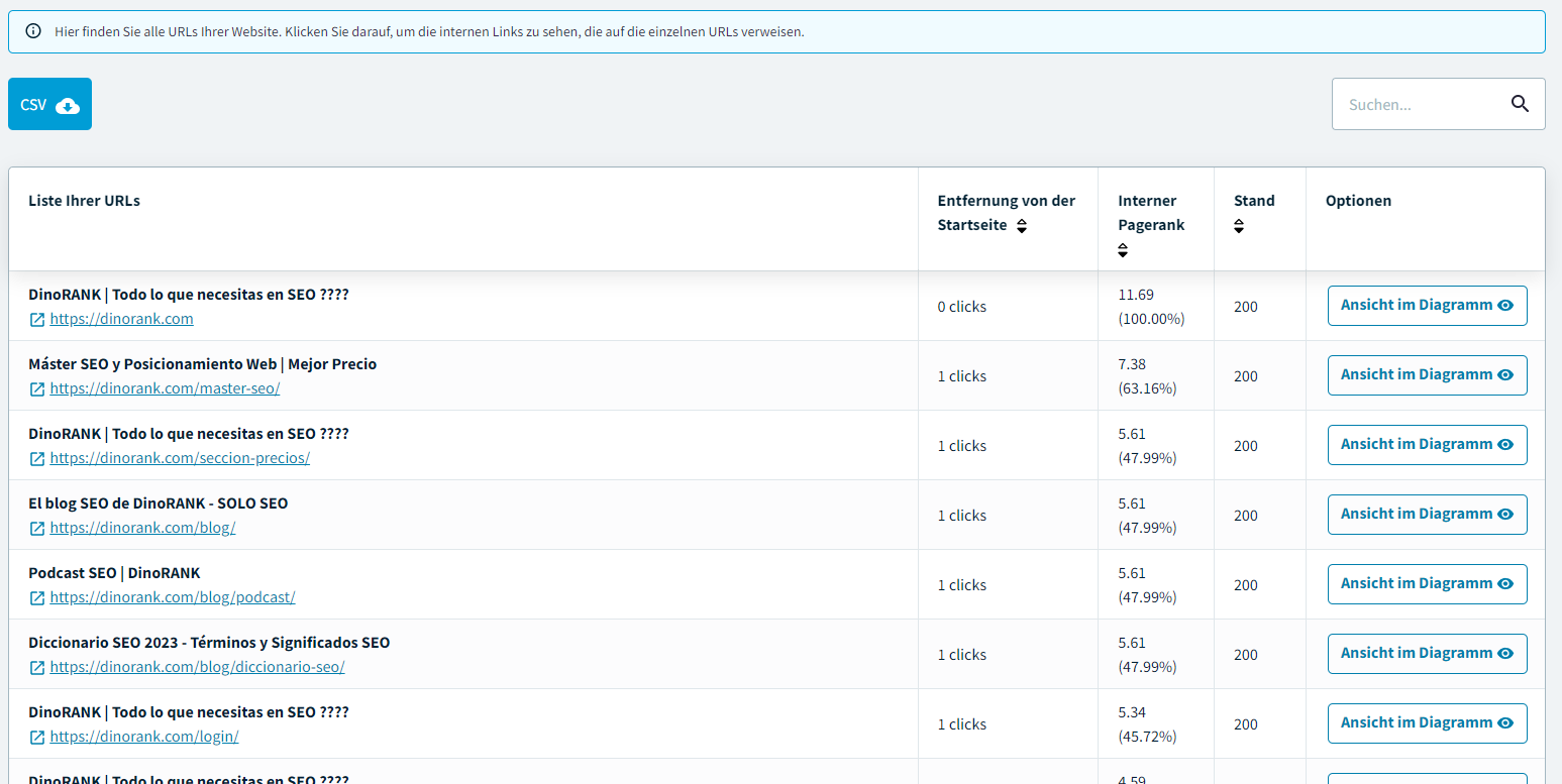 In dieser Liste können Sie verschiedene Daten sehen, um den internen Pagerank Ihrer Website zu verbessern: