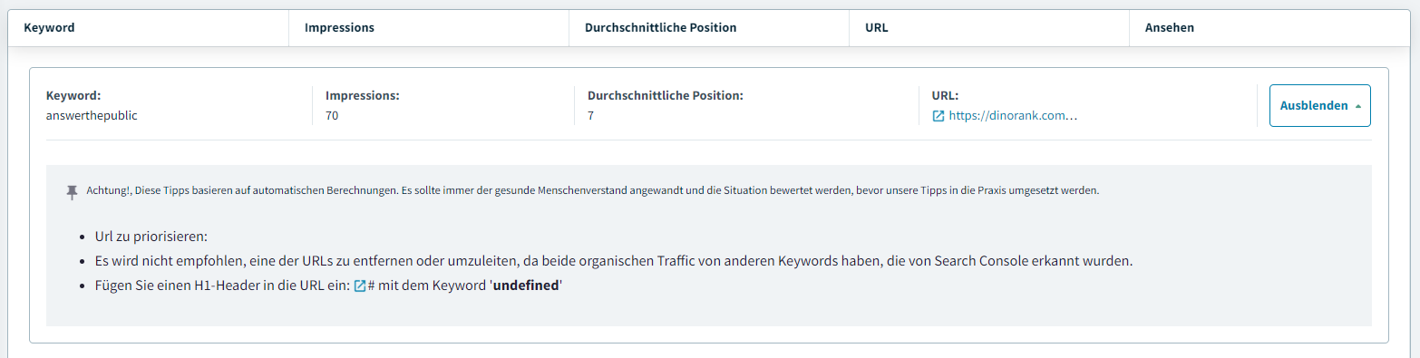 Und sie gibt Ihnen auch Tipps. Diese Tipps sind automatisiert, so dass Sie selbst beurteilen müssen, ob sie für Ihre Strategie des organischen Verkehrs geeignet sind oder nicht.