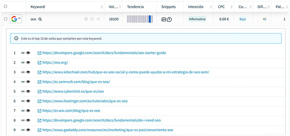 - Descubre quién es tu principal competencia en Google en base a las keywords que monitorizas.