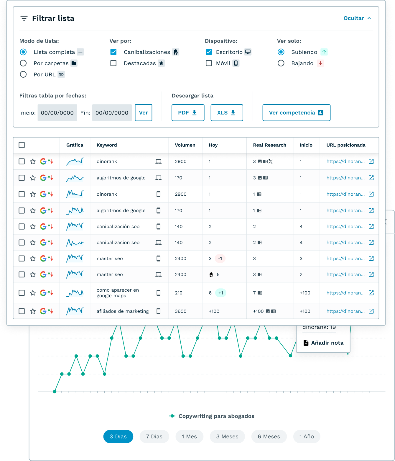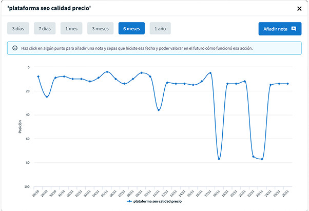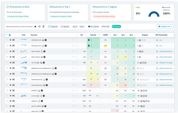 - Controla de forma hiper precisa el movimiento y la posición de tus keywords en los resultados de búsqueda de Google.