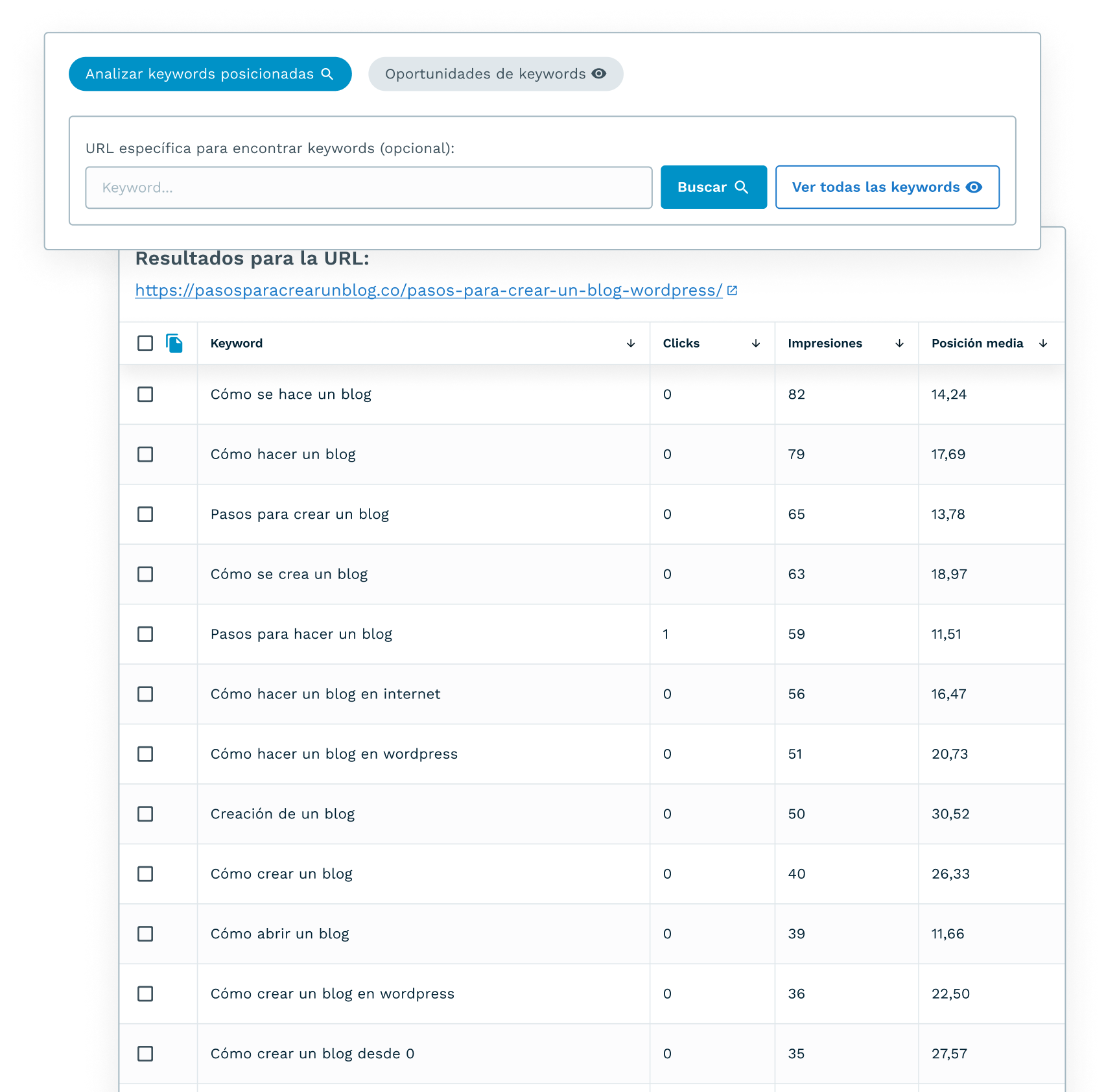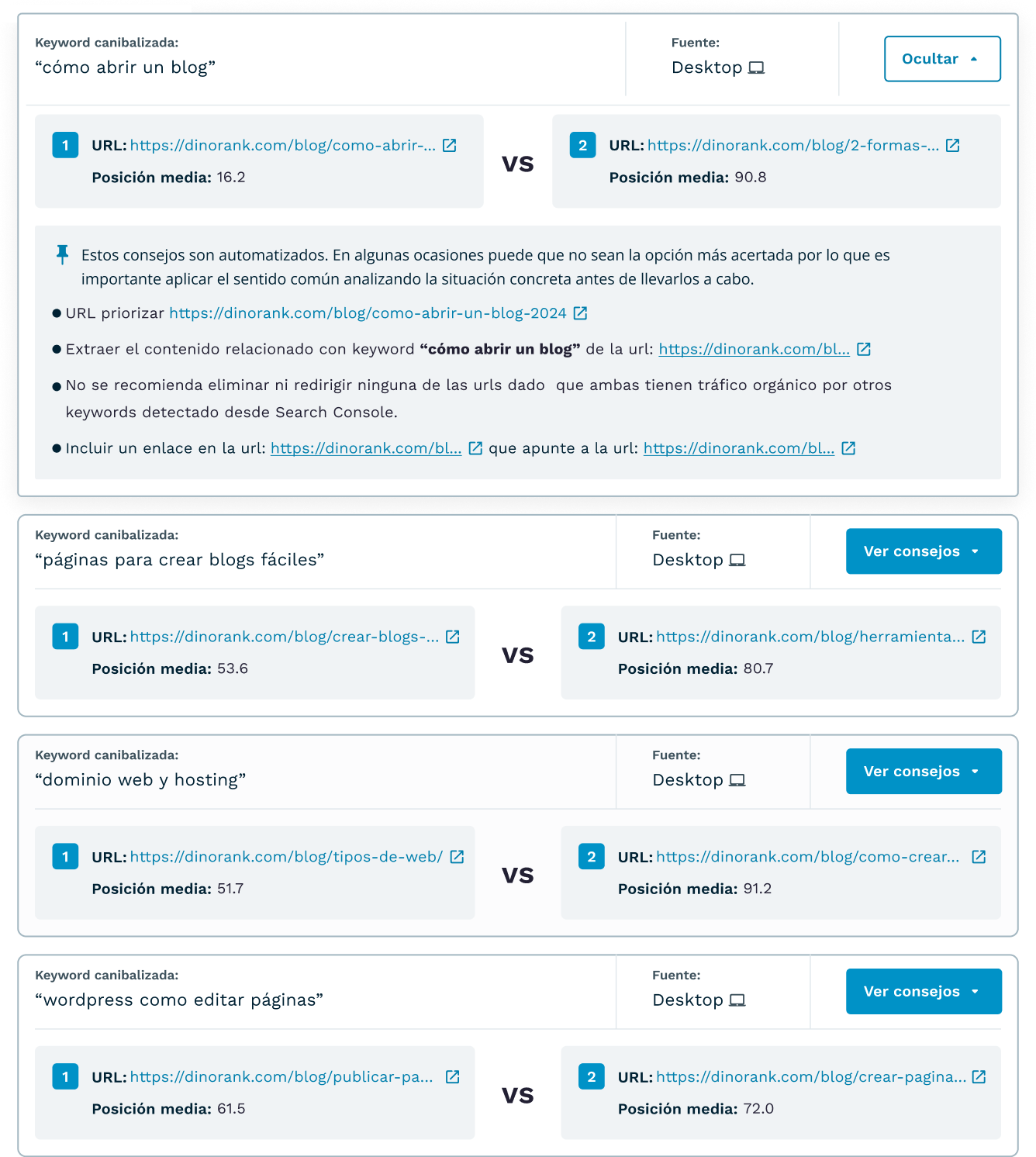 - Detecta si tienes URLs compitiendo por la misma keyword que estén confundiendo a Google.