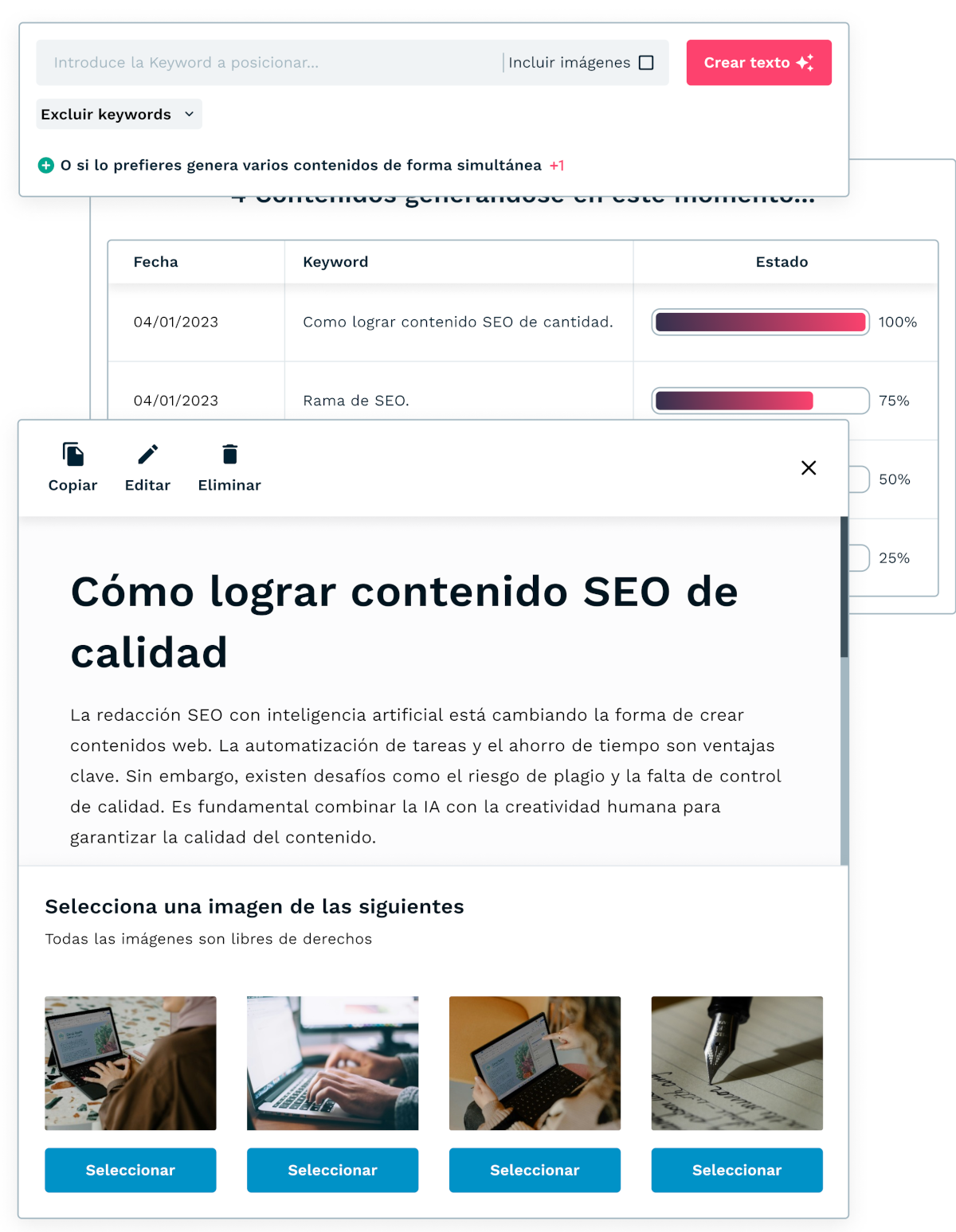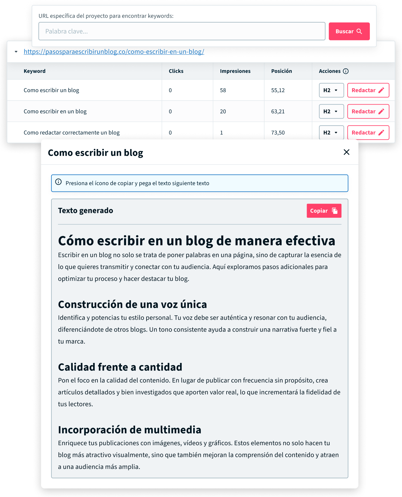 - Genera con un clic fragmentos de texto y añadelos a tu contenido para optimizarlos para dichas keywords.