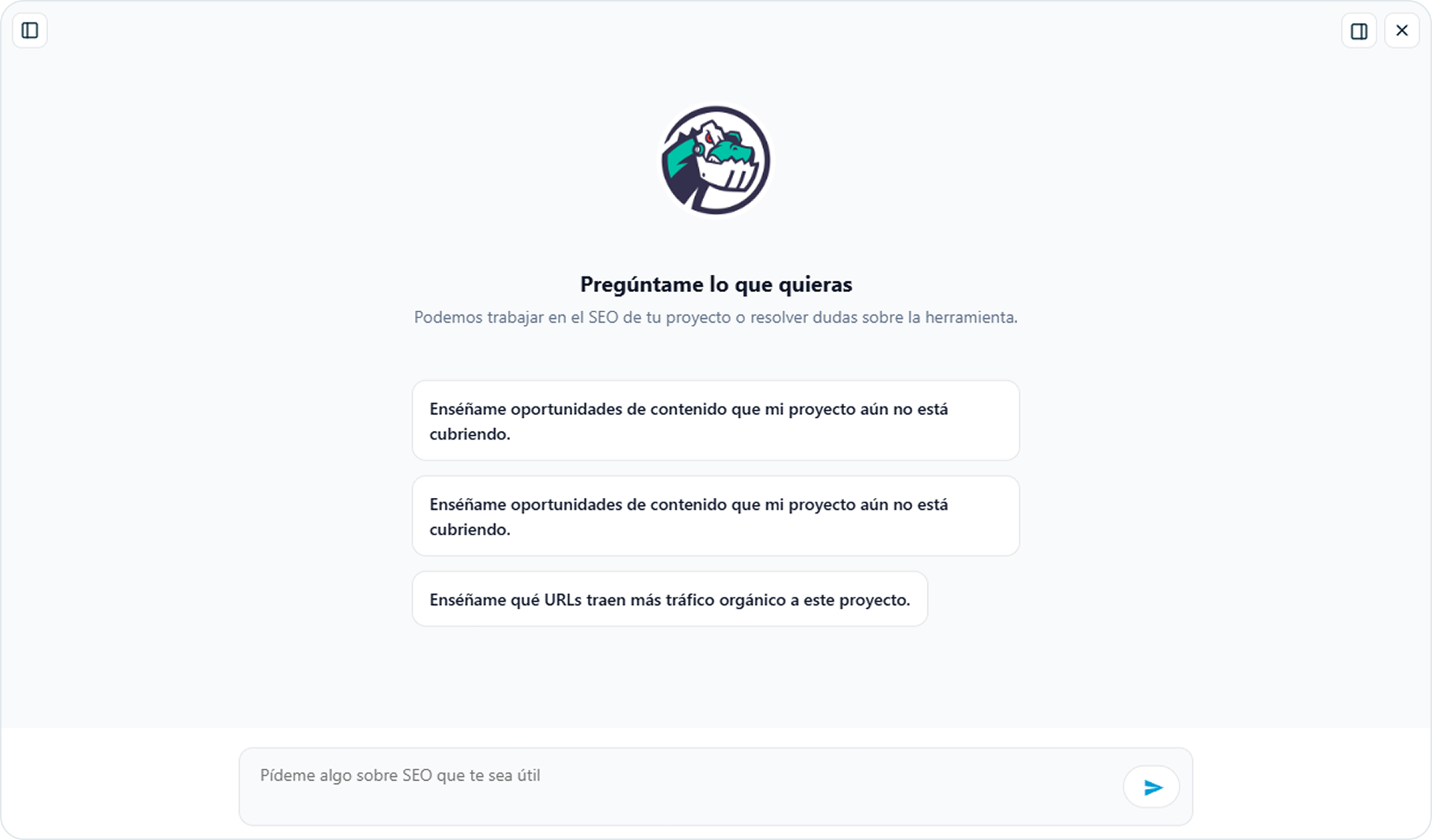 DinoRANK Copilot es un chatbot de inteligencia artificial que se integra con todas las funciones de DinoRANK y se conecta con tu proyecto para ayudarte a entender tus datos, resolver tus dudas y tomar mejores decisiones a nivel de SEO.