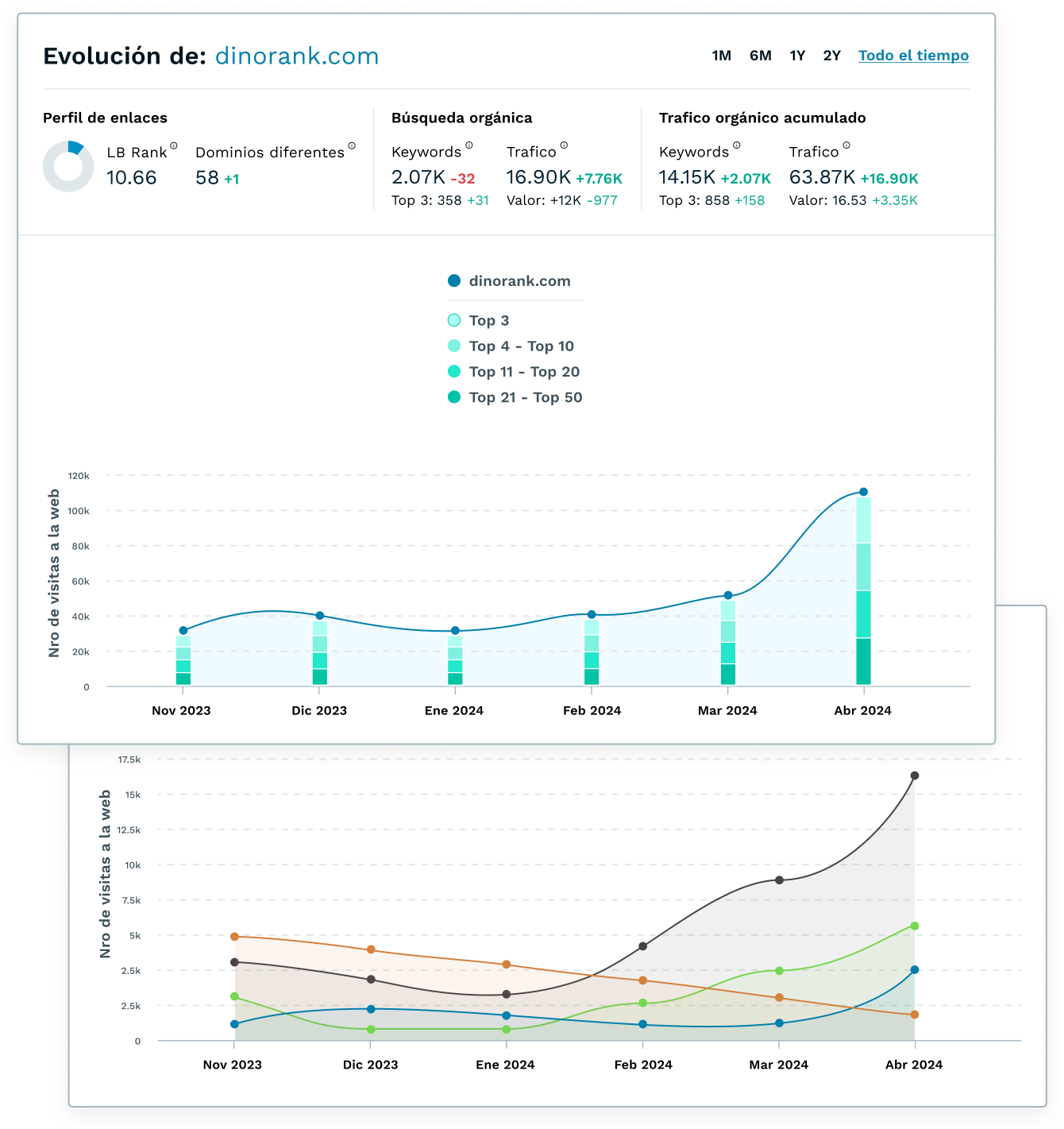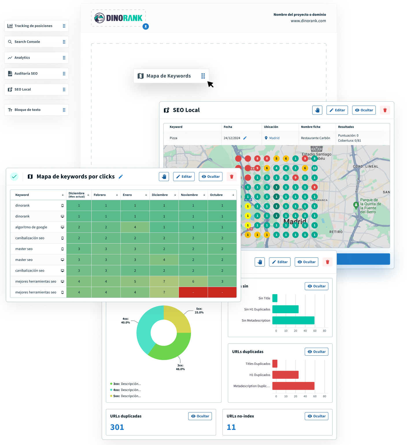 - Combina datos de DinoRANK, Google Analytics y Google Search Console.
