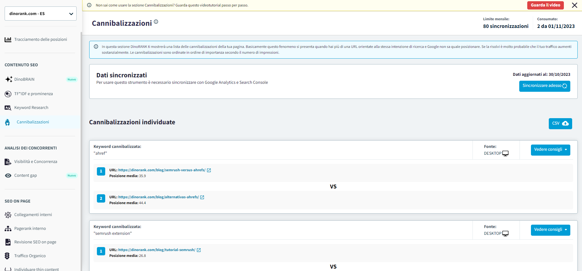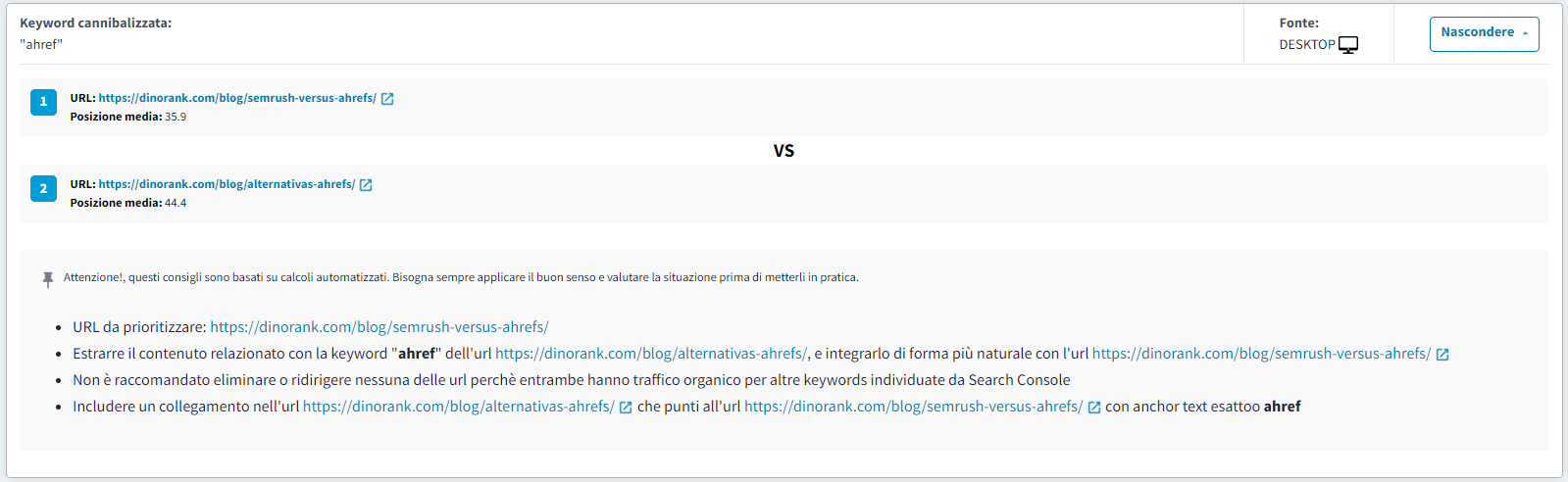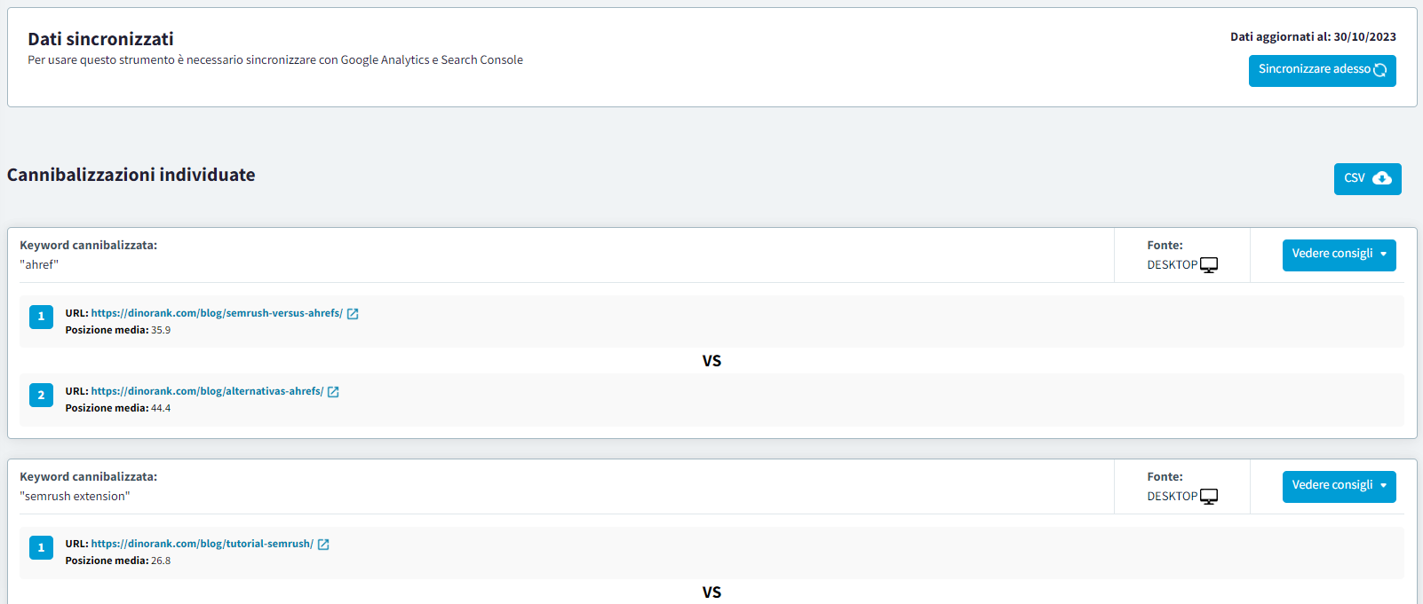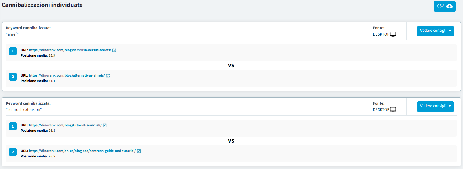 DinoRANK rileva la cannibalizzazione delle parole che avete nella vostra il vostro sito web o il vostro e-commerce e vi offre consigli su come potete soluzioni.