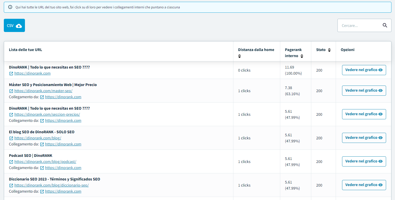 Compare l'elenco delle URL e DinoRANK ti dice la distanza dalla quale si trovano le URL dalla home, il loro pagerank interno (la forza SEO che trasmette quel collegamento), il suo stato e come è collegato.