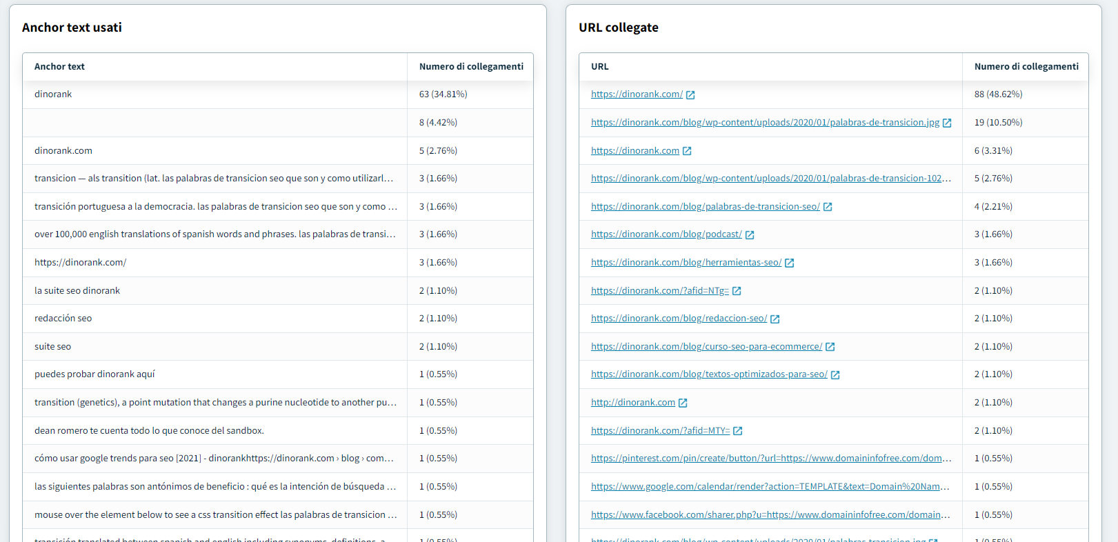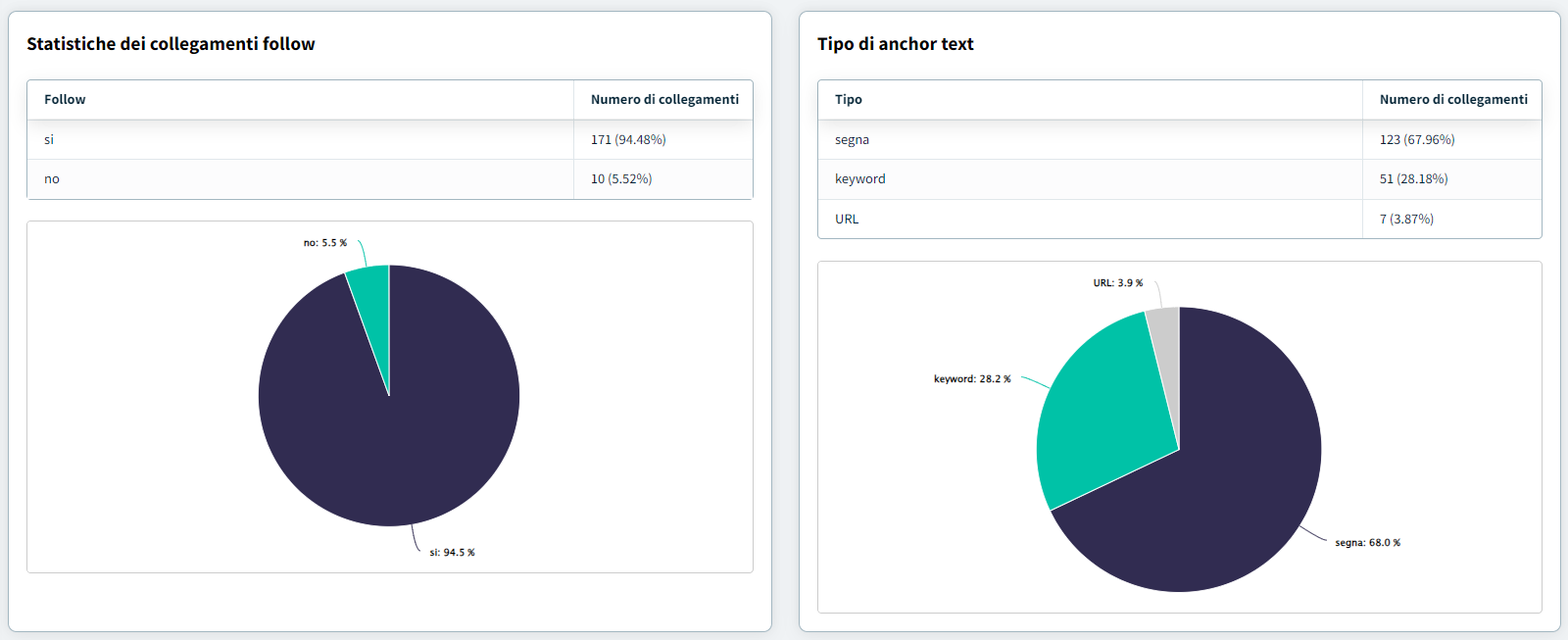 Tutte queste informazioni servono per vedere e verificare che tutta sia a posto e ottenere statistiche sulle proporzioni di collegamenti follow, no follow e anchor text usati.