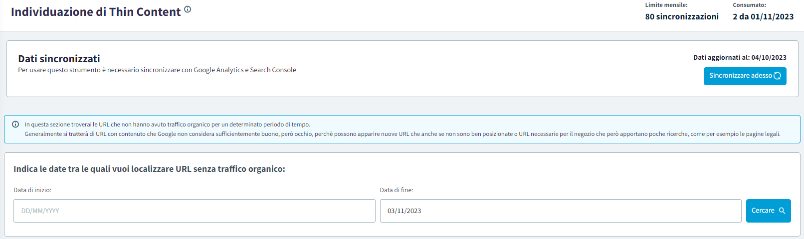 La funzione Thin Content ti aiuta a trovare il contenuto duplicato o di bassa qualità e lavorarci su in maniera che Google non penalizzi la tua posizione nella SERPS