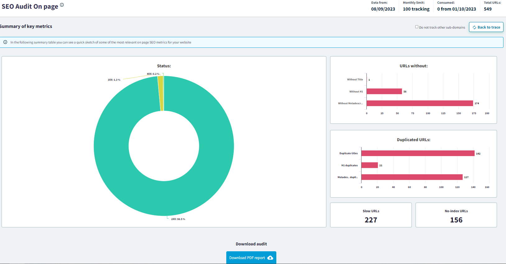 Esa gráfica te ofrece un resumen muy visual de todo lo que tienes que trabajar de esa página web si quieres realizar una Auditoría SEO efectiva: URLs sin indexar, URLs duplicadas y URLs lentas.