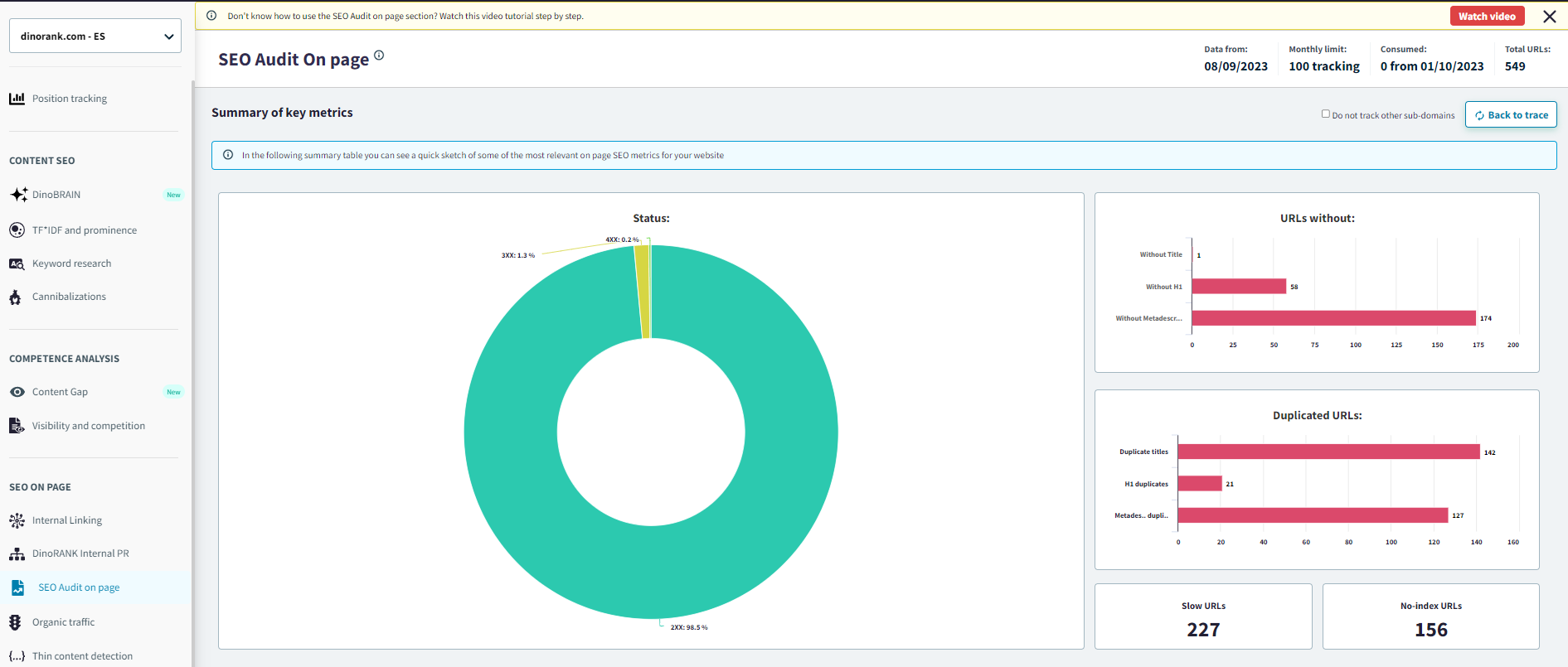 URLs lentas. DinoRANK indica todas las URLs que tardan más de 1 segundo en cargar. Afecta a la experiencia de usuario y Google lo penaliza.