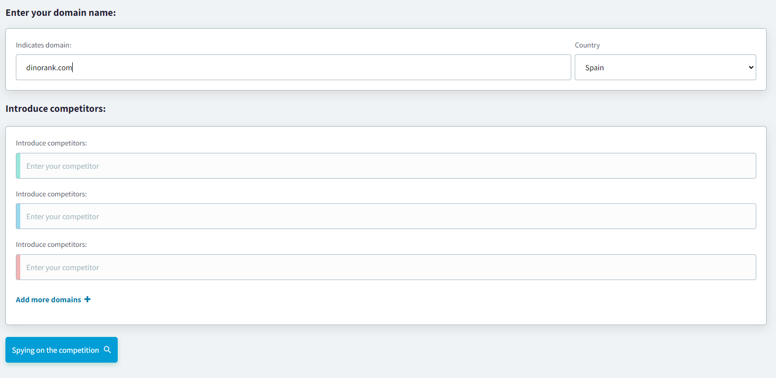 Lo primero que tienes que hacer es introducir tu dominio y el de tus competidores para que la herramienta encuentre las palabras clave que ellos ya están posicionando en Google y tú no.