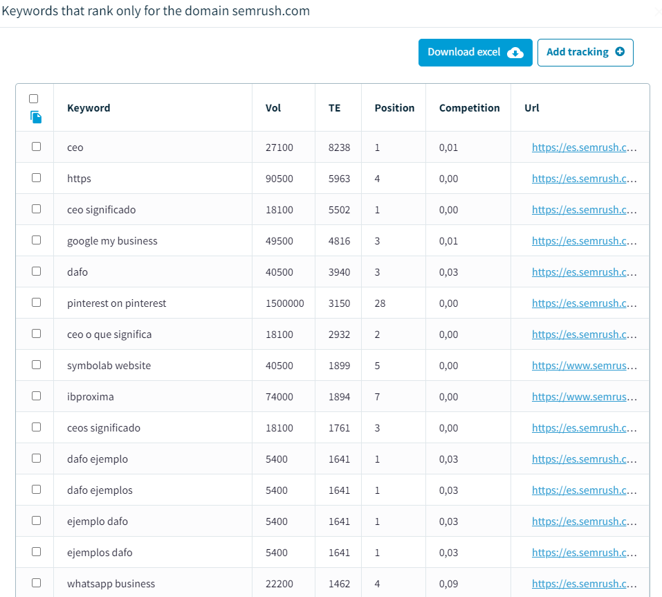 Además, podrás descargarte todo el listado en excel y añadir las keywords que desees al módulo de tracking de posiciones para empezar a monitorizarlas.